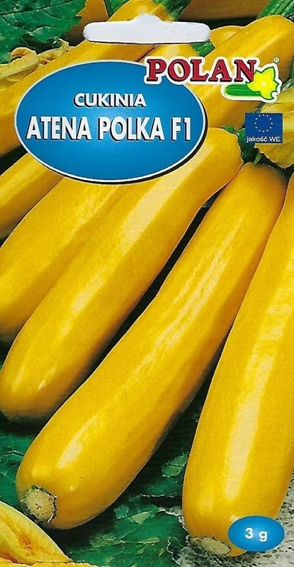 Cukinia Atena Polka F1 Polan zawiera 3g nasionoraz informacje o terminie przydatności do siewu i ogólnych zasadach uprawy.