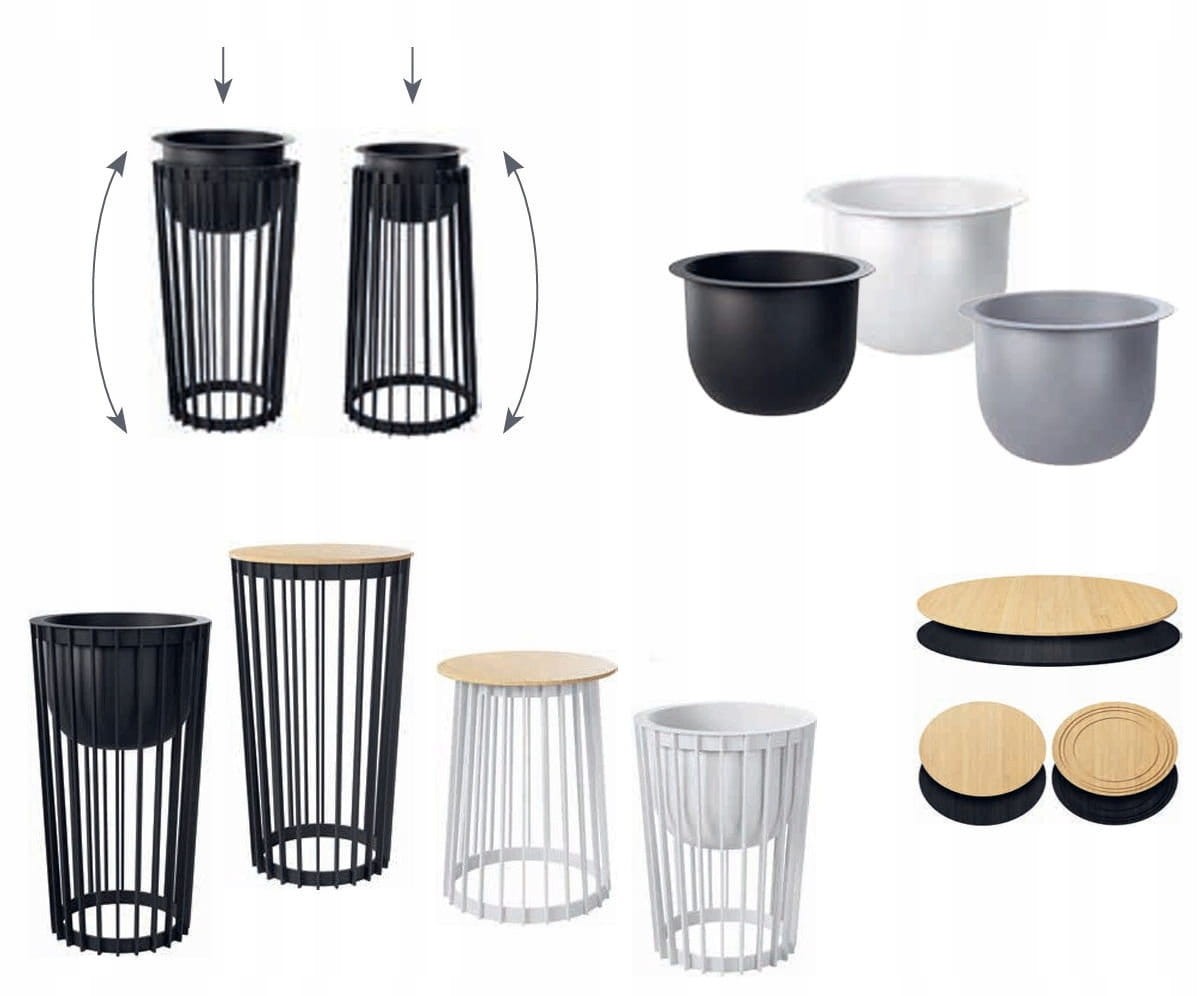 Kwietnik występuje w dwóch wysokościach oraz trzech kolorach. Dostępne są do niego wkłady w średnicach 30 i 40 cm Kwietnik z jednej strony ma otwór dopasowany do mniejszego a z drugiej do większego wkładu. Wkłady również dostępne są w trzech kolorach dzięki czemu możliwa jest dowolna konfiguracja.