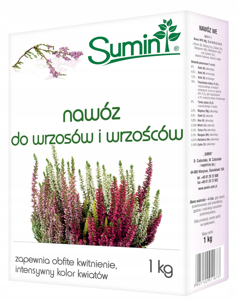 Granulowany nawóz firmy Sumin przeznaczony jest do nawożenia wrzosów i wrzośców. Specjalne formy azotu, fosforu oraz szybko przyswajalny magnez decydują o prawidłowym i rozłożony w czasie działaniu nawozu i skutecznym pobieraniu składników pokarmowych przez rośliny. Przewaga fosforu i potasu w stosunku do azotu zawartego w nawozie umożliwia właściwy rozwój i obfite kwitnienie roślin. Każda granulka zawiera deklarowane składniki pokarmowe, zapewnia to ich równomierne rozmieszczenie na powierzchni gleby. Regularne stosowanie nawozu zapewnia właściwy wzrost roślin, obfite kwitnienie i piękny pokrój roślin.