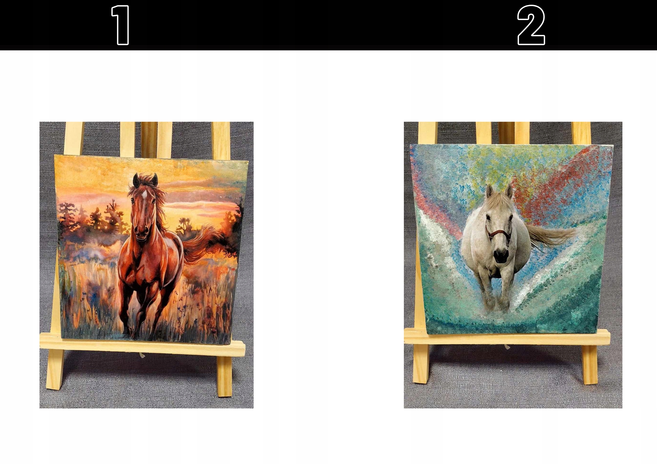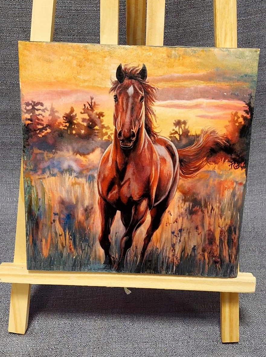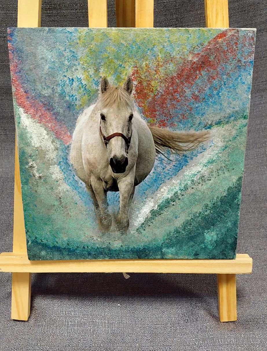 Piękny obraz wykonany techniką decoupage z wizerunkiem konia, idealny jako dekoracja do pokoju lub prezent na różne okazje. Starannie wykonany z dbałością o detale, przedstawia konia w subtelnej, pastelowej kolorystyce, która wprowadza ciepłą i spokojną atmosferę.