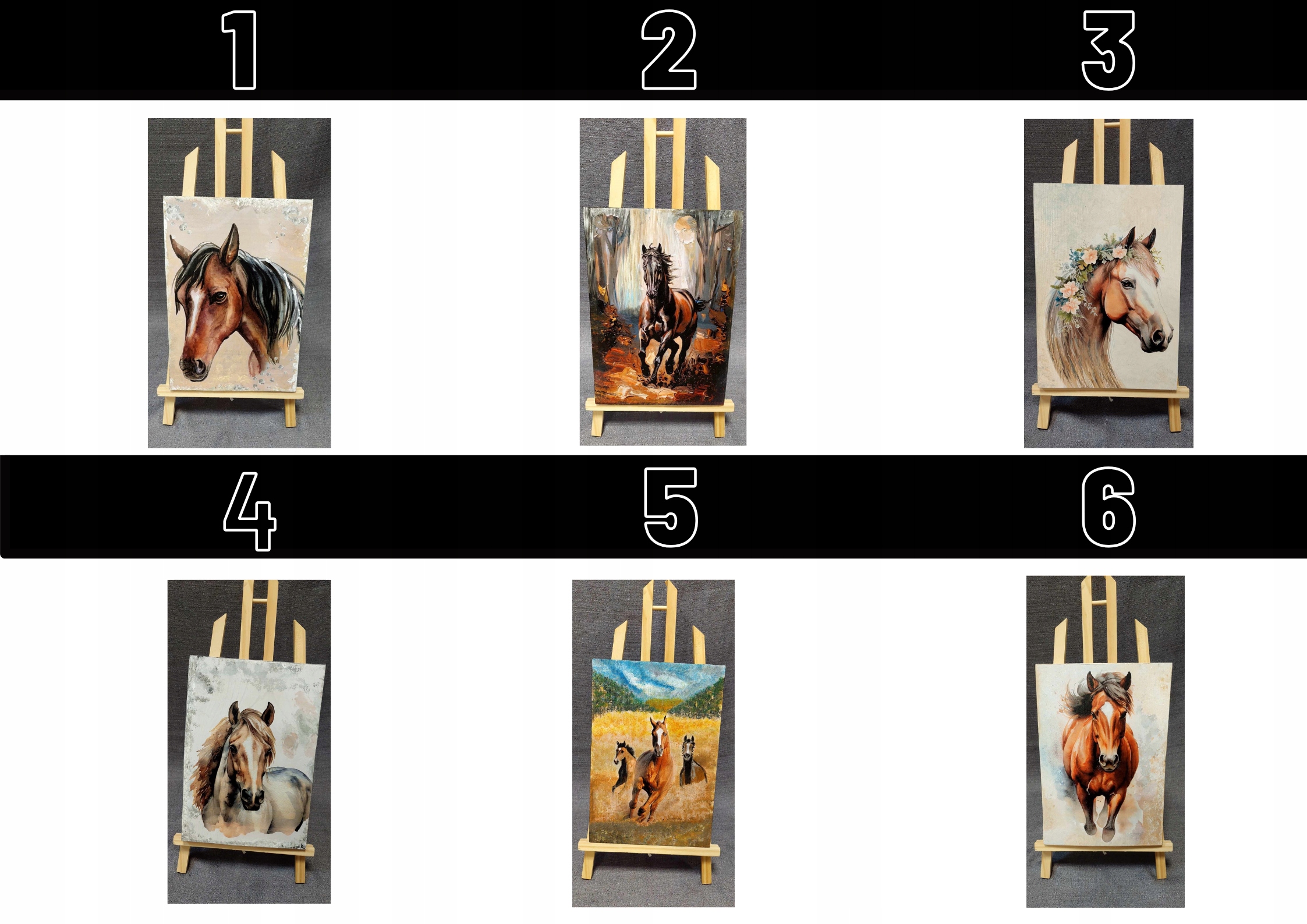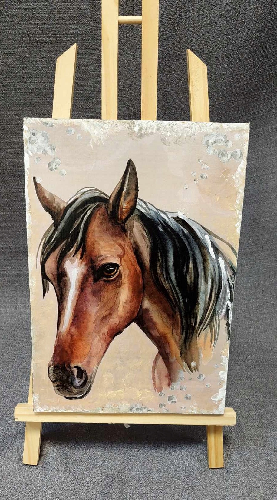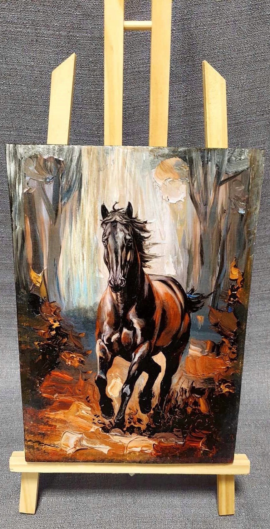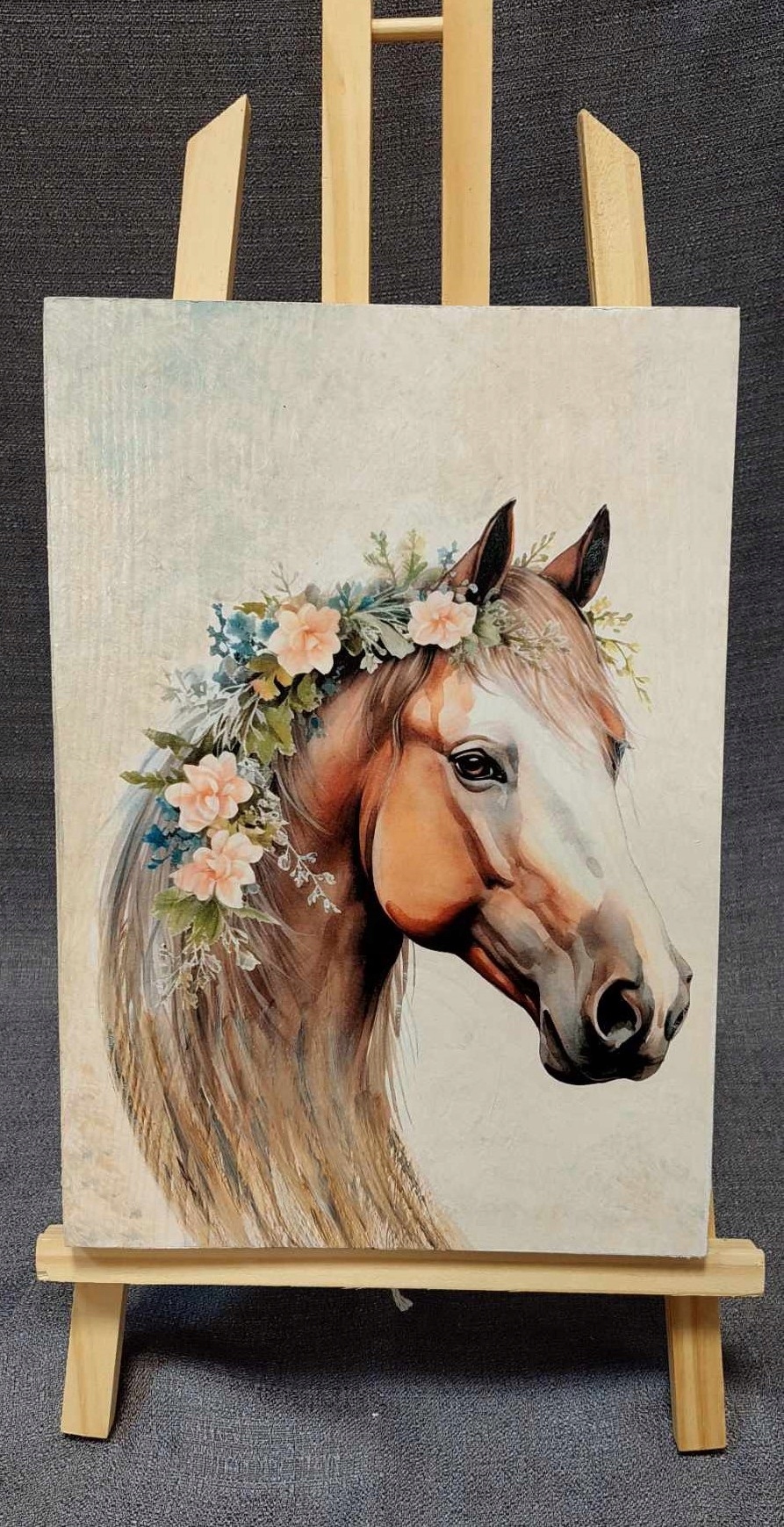 Elegancki obraz wykonany techniką decoupage, przedstawiający konia. To doskonały dodatek do pokoju lub wyjątkowy prezent na różne okazje. Starannie wykonany, z dbałością o każdy szczegół, ukazuje konia w delikatnej, pastelowej kolorystyce, tworząc ciepłą i kojącą atmosferę.