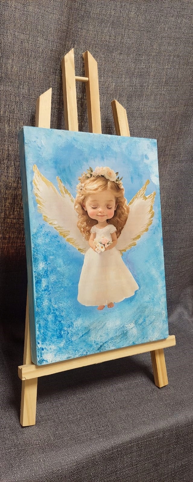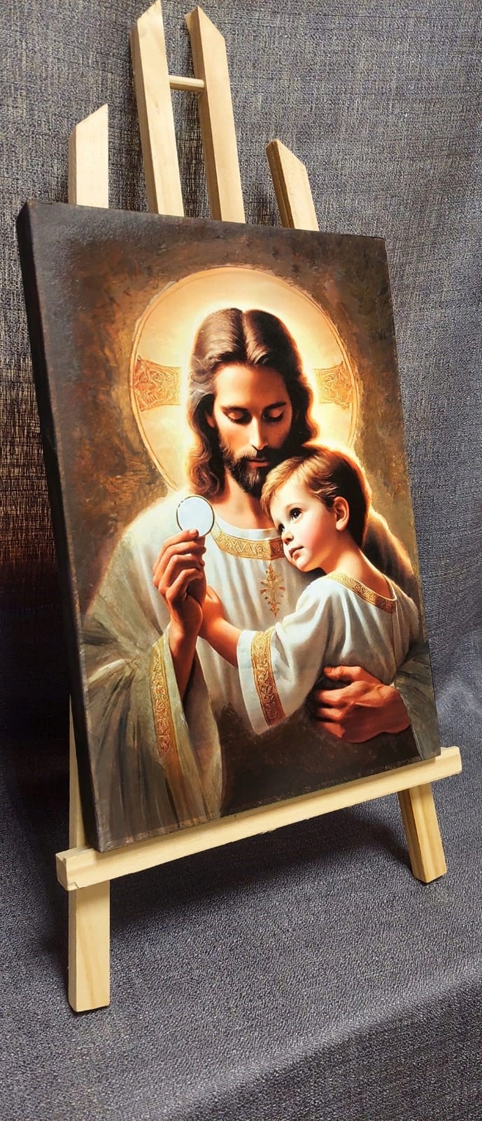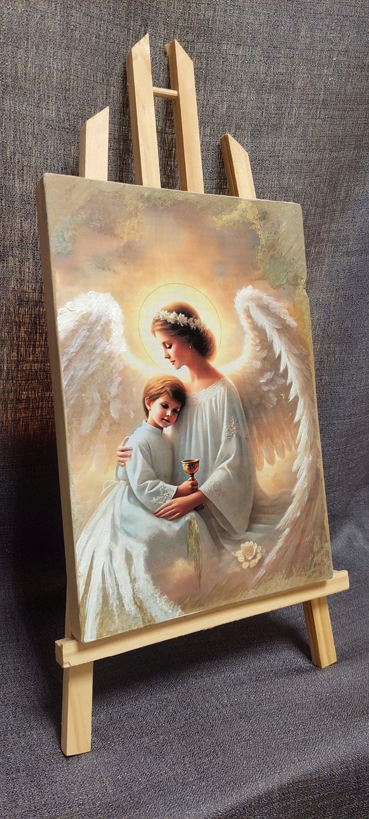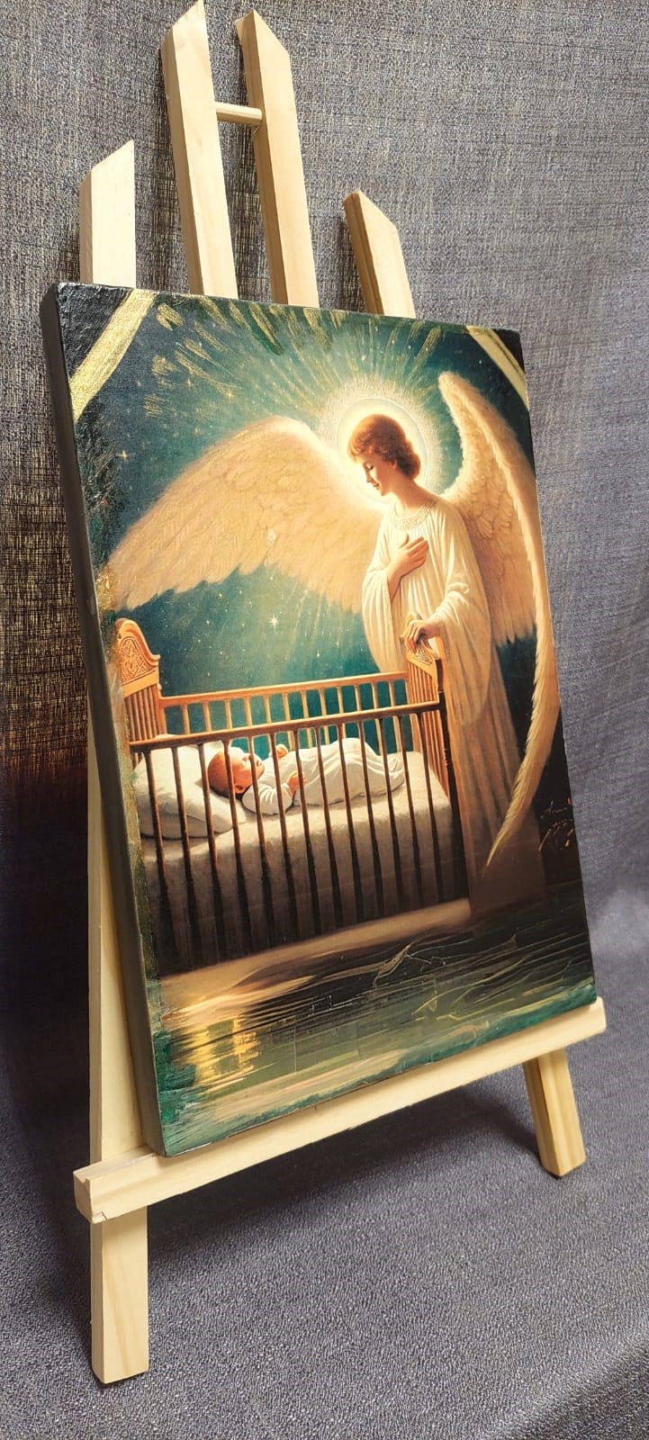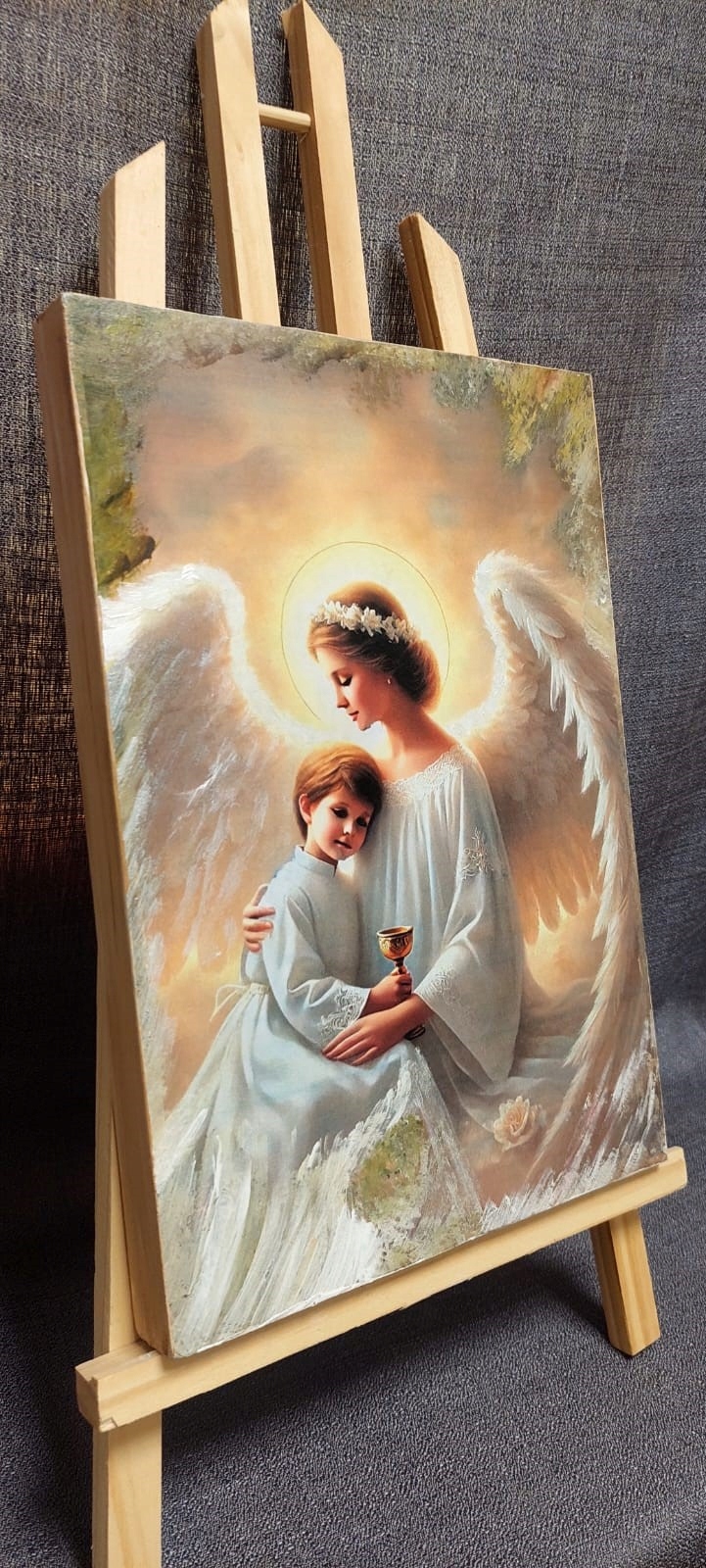 Obraz gotowy do zawieszenia lub postawienia. Doskonały także jako pamiątka religijna lub dodatek do pokoju dziecięcego.